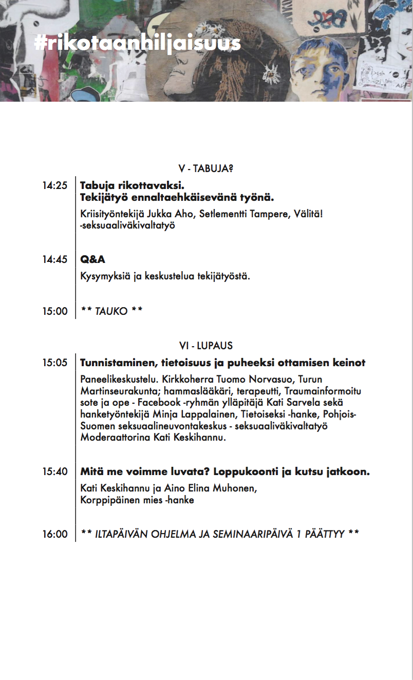 Paneelikeskustelu. Kirkkoherra Tuomo Norvasuo, Turun Martinseurakunta; hammaslääkäri, terapeutti, Traumainformoitu sote ja ope - Facebook -ryhmän ylläpitäjä Kati Sarvela sekä hanketyöntekijä Minja Lappalainen, Tietoiseksi -hanke, Pohjois-Suomen seksuaalineuvontakeskus - seksuaaliväkivaltatyö Moderaattorina Kati Keskihannu.